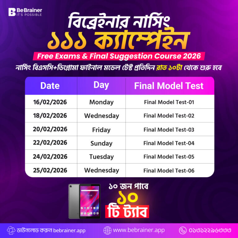 111 Campaign Free Exams & Final Suggestion Course 2026 বিশেষ আকর্ষণ: ১১১ ক্যাম্পেইন থেকে জাতীয় মেধায় সেরা ১০ জনের জন্য ১০টি ট্যাব পুরস্কার। ক্যাম্পেইন এর কার্যক্রম শুরু হবে ১৫ ফেব্রুয়ারি, ২০২৬। কমপক্ষে ১০ জন বন্ধুকে BeBrainer Nursing ফেসবুক গ্রুপ এবং BeBrainer Nursing Ltd. ফেসবুক পেইজে ইনভাইট করলে সম্পূর্ণ ফ্রি এক্সেস দেয়া হবে। 🔥 BeBrainer Nursing…