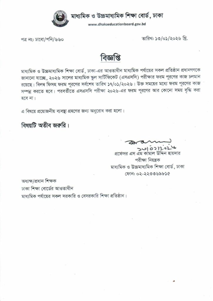 বিলম্ব ফিসহ ফরম পূরণের সর্বশেষ তারিখ: ১৭ জানুয়ারি ২০২৬