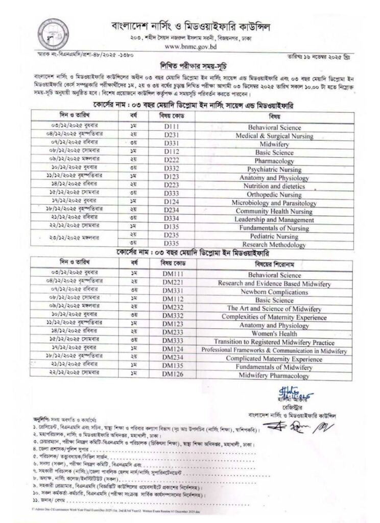 বাংলাদেশ নার্সিং ও মিডওয়াইফারি কাউন্সিল (BNMC) ৩০ মাস মেয়াদী ডিপ্লোমা ইন নার্সিং সায়েন্স এন্ড মিডওয়াইফারি এবং ডিপ্লোমা ইন মিডওয়াইফারি কোর্সের ১ম, ২য় ও ৩য় বর্ষের চূড়ান্ত পরীক্ষার রুটিন প্রকাশ করেছে।